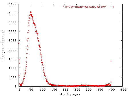 Rayner K Rosich found an error in the graph in chapter 8, figure 8.3. The graph in the book cuts off the left-most data points of the chart's y-axis; the raw data shows that 2346 pages didn't change (y=2346, x=0), while 606 changed once (y=606, x=1). This can be barely seen in the original gnuplot output that we sent to Addison-Wesley:
